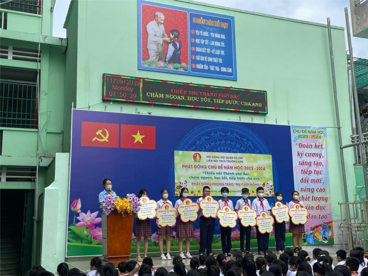 Trong không khí phấn khởi của những ngày đầu năm học mới, Liên đội đã tổ chức Lễ phát động Chủ đề công tác đội năm học 2023 - 2024: "Thiếu nhi Thành phố Bác, chăm ngoan, học tốt, tiếp bước cha anh". Trong buổi lễ , hưởng ứng Chủ đề năm học các chi đội đã đăng ký các công trình măng non của chi đội, hứa hẹn một năm học mới đầy vui tươi và gặt hái thật nhiều thành tích tốt. Chúc các em đội viên nhà trường sẽ luôn vui, khỏe, học giỏi, chăm ngoan, vâng lời cha mẹ, thầy cô giáo.